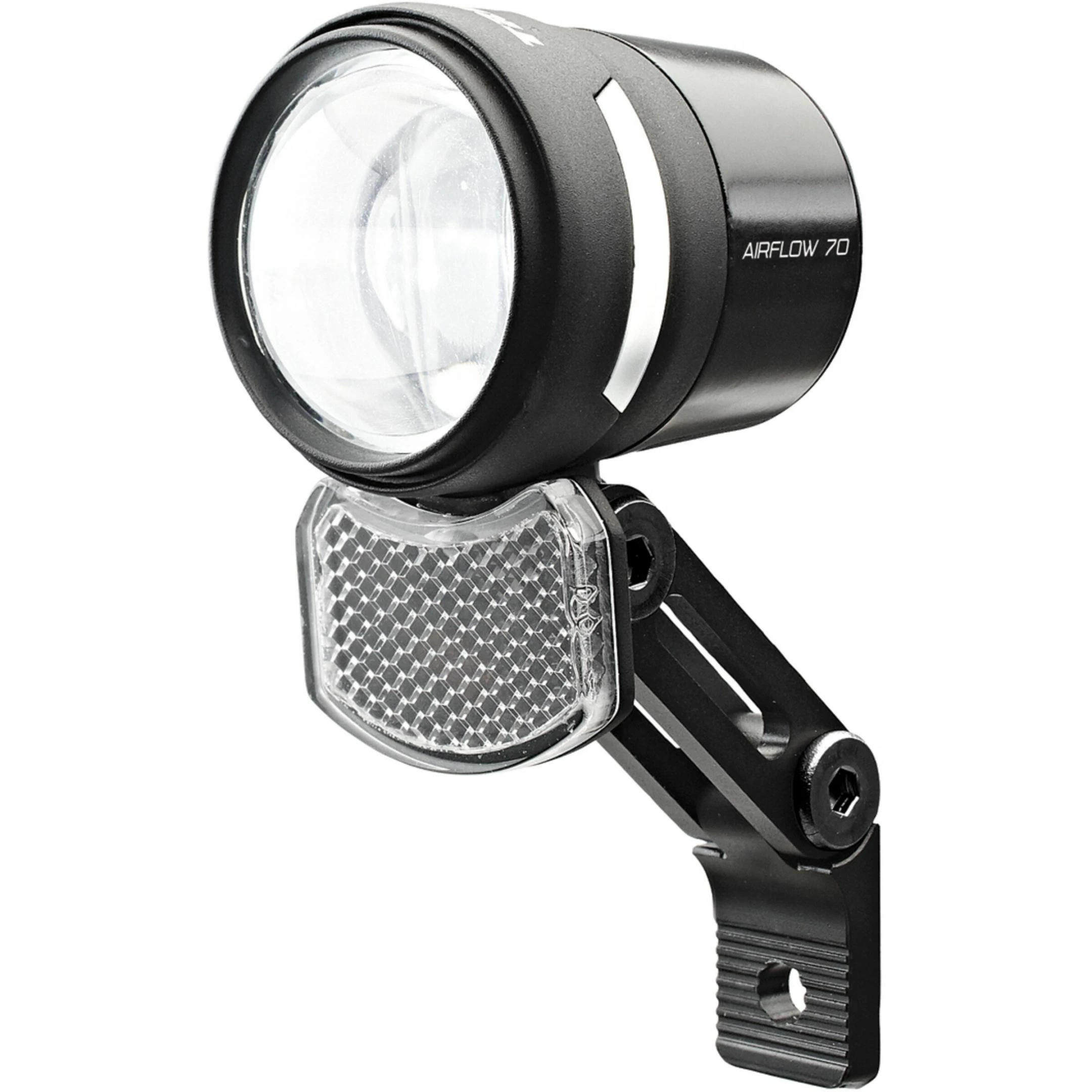 Eclairage avant vélo Trelock LS785 i Airflow 70. Offre un éclairage de 70 lux grâce à la technologie à double lentille. Deux fenêtres dans le boîtier augmentent la visibilité sur le côté et un petit réflecteur amovible permet d’affiner la silhouette.